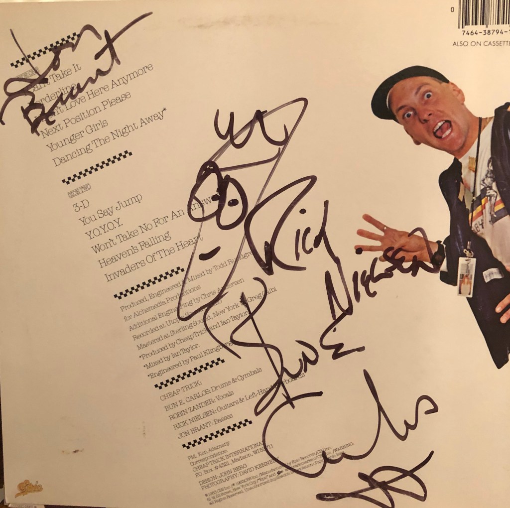 Earlier that day, we rubbed elbows with the band at Peaches Records & Tapes at 75th and Metcalf, acquiring much-sought after autographs. My buddy Gregg and I were both wearing out Cheap Trick 81 shirts from our first Trick show. Guitarist greeted us with, “The double-mint twins! Hey, when I see you two tonight, this is for you!” With a smile, he then held up both middle fingers. We didn’t laugh.