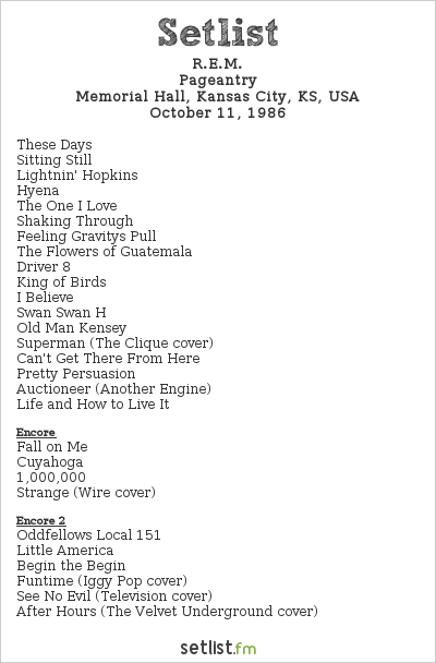 Originally recorded by The Clique in 1969, “Superman” was rerecorded by R.E.M. for Pageant. Another great cover was “Strange,” originally recorded by Wire in 1977. The song would be on the upcoming R.E.M. release Document in 1987. The other covers were performed as the final three songs during the second encore. They included “Funtime” by Iggy Pop, “See No Evil” by Television, and “After Hours” by The Velvet Underground.