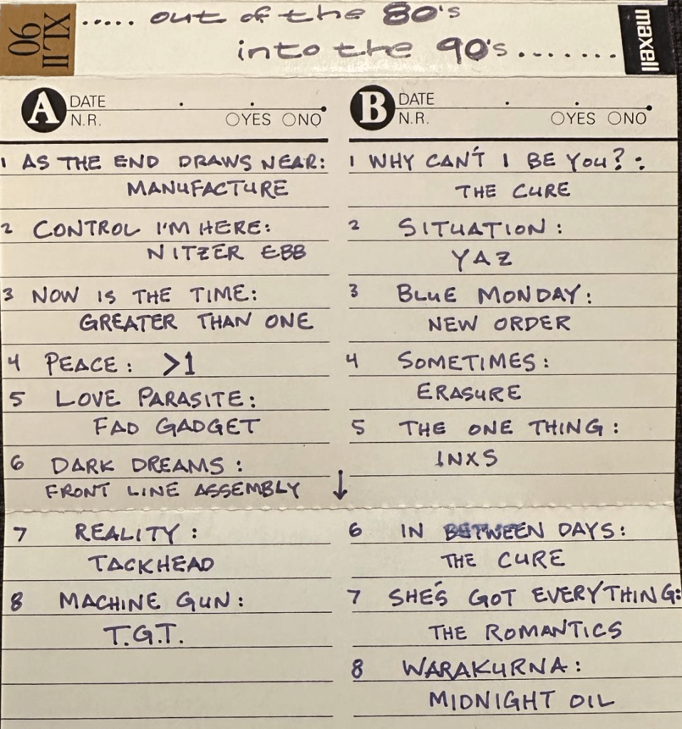 Mixtape Memories Mixtape Memories: …Out of the 80s, Into the 90s…, 12/31/89 By No Earplugs on December 31, 1989 • ( Leave a comment ) Share this:Tweet Click to email a link to a friend (Opens in new window) Email Like Loading... Related Categories: Mixtape Memories