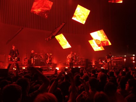 The show began with the beautiful “All I Need” (“I’m the next act / Waiting in the wings”) as red lasers flashed on dozens of tubes hanging from the rafters. Behind the tubes was a large, rectangular screen that showed the band members from several different angles. As the evening progressed, a variety of lasers, lights, and designs shone on the tubes.
