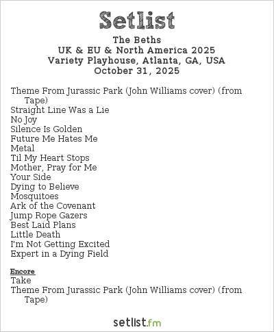 This is maybe only the second time in the Beth‘s career performing on Halloween. Singer Elizabeth Stokes replied to a fan, “Have we ever played on Halloween? I think the only time was in 2014.” Guitarist Jonathan Pearce chimed in, “Yeah, it was in my flat.” Stokes added, “You were dressed as Jesus. All you need is a beard and a sheet.” On this evening in Atlanta, the band took the stage to John Williams’s Jurassic Park theme with Stokes in all black wearing shades (as chaos theorist Ian Malcolm), Pearce dolled up as Ellie Sattler, drummer Tristan Deck looked a lot like Alan Grant, and bassist Benjamin Sinclair donned a blow-up dinosaur (Godzilla?) costume dubbed “T-Rex/Velociraptor.” And yes, he wore that thing all night.