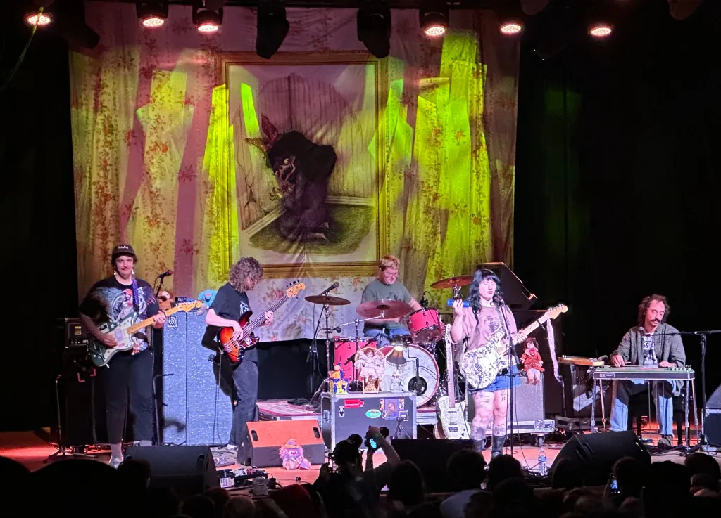 Lead singer-songwriter Karly Hartzman writes songs that underscore life in the South, much like her idol Patterson Hood of Drive-By Truckers. In fact, Wednesday covered the Truckers’ tune “Women Without Whiskey” on the band’s 2022 covers album Mowing the Leaves Instead of Piling ‘Em Up. To their credit, Hood has publicly endorsed the band as one of his favorites. Hartzman even pointed to her vintage Truckers T-shirt during the show, quipping, “Whenever I find vintage DBT stuff, I buy that shit.”