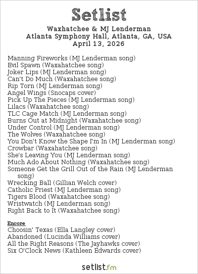 For more information on the tour, visit the artist’s websites at Waxahatchee, MJ Lenderman, and Brennan Wedl. Check out setlist below and the #SetListPlayList under it.